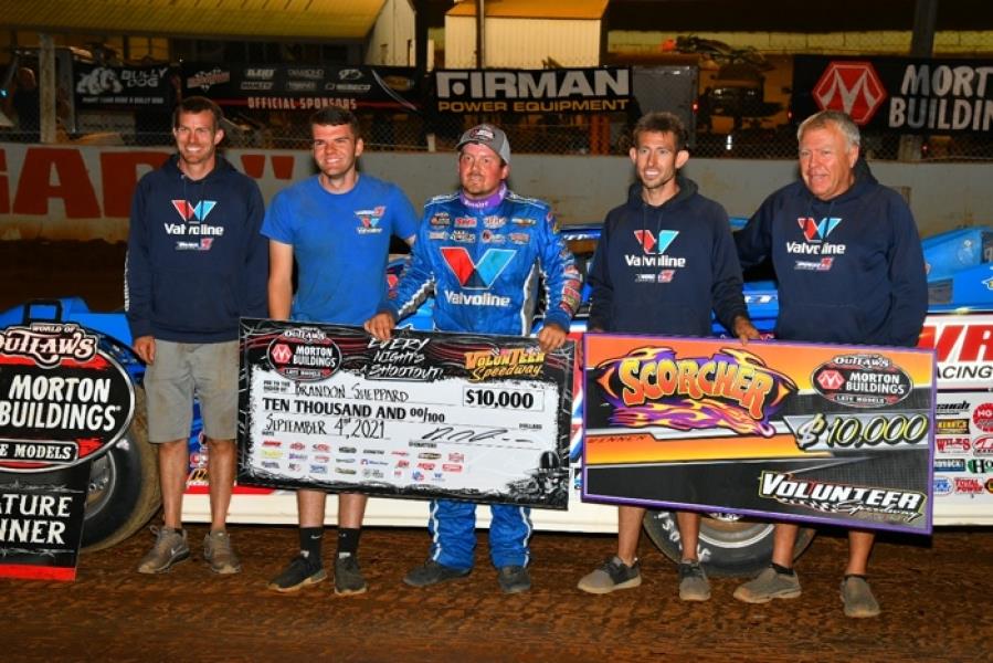 With 27 Late Models entered on Saturday at Volunteer Speedway (Bulls Gap, Tenn.) for the Scorcher 100, Sheppard clocked in third fastest in his group before placing second in his heat race. Avoiding an early scrape on the opening circuit of the feature, Brandon led flag-to-flag in the 40-lapper to bag his ninth win of the season and $10,000 prize. He finished ahead of Chris Madden, Michael Chilton, Tyler Bruening, and Dennis Erb Jr.