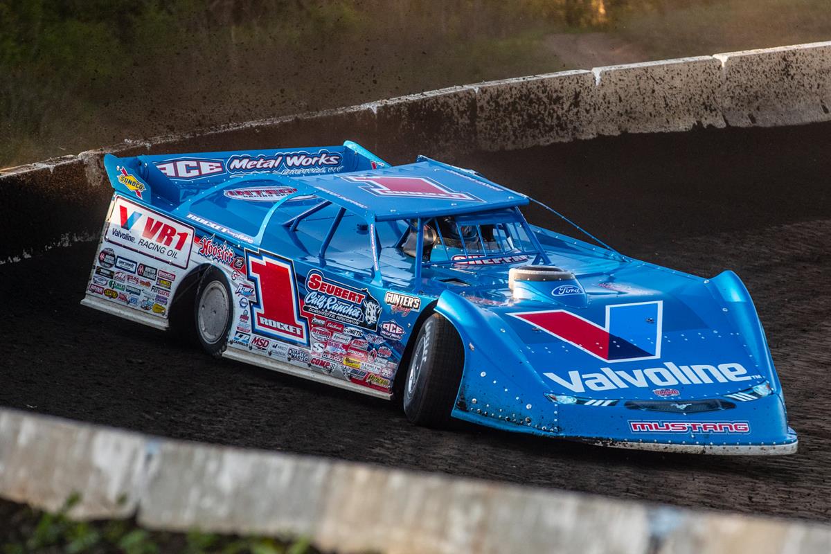 Brandon Sheppard piloted the Rocket1 Racing/ Valvoline No. 1 Seubert Calf Ranches/ Durham Racing Engines-powered XR1 Rocket Chassis Super Late Model to Victory Lane on Friday night at Wisconsin’s Mississippi Thunder Speedway. (Tyler Rinken photo)