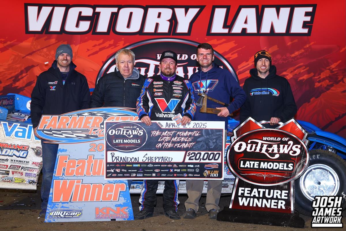 SHINNSTON, W.Va. (04/14/25) – Brandon Sheppard and Rocket1 Racing roared back into victory lane Saturday night, snapping their recent drought with a $20,000 World of Outlaws Late Model Series triumph at Farmer City Raceway.